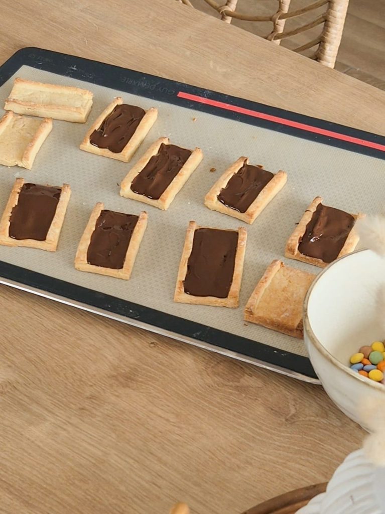 Pendant ce temps, vous préchauffez le four à 180 degrés. Vous étalez ensuite la pâte sur un plan de travail légèrement fariné, puis vous découpez des rectangles. À l’aide de petits morceaux de pâte, vous formez délicatement des rebords autour de chaque rectangle en les collant avec un peu d’eau. Vous déposez les barres sur une plaque recouverte de papier cuisson et vous enfournez pour environ 12 minutes, jusqu’à ce qu’elles soient légèrement dorées.