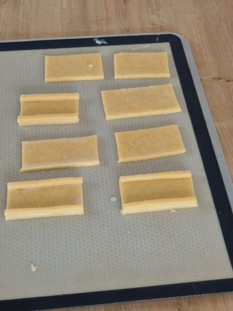 - Avec de petits morceaux de pâte, formez des rebords autour de chaque rectangle et collez-les avec un peu d’eau.