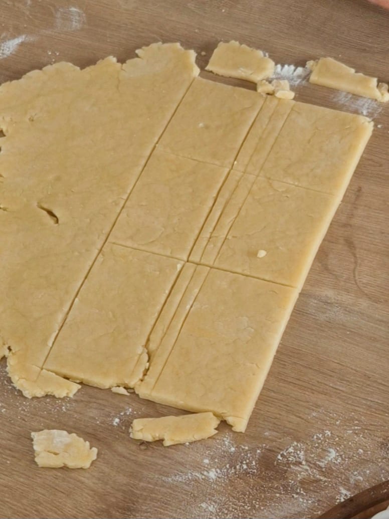 - Étalez la pâte sur un plan de travail légèrement fariné et découpez des rectangles.