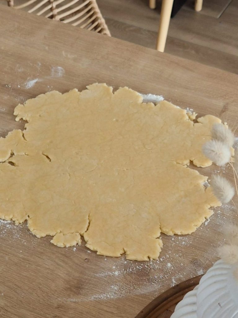 - Si la pâte colle légèrement, farinez très légèrement le plan de travail ou étalez-la entre deux feuilles de papier cuisson.